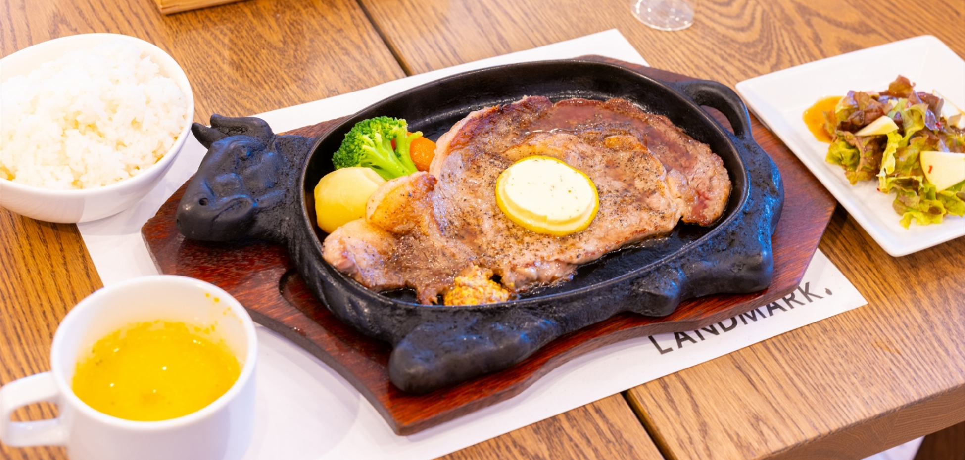 LANDMARK. opened in April 2023, taking over a restaurant that has been in the area for about 50 years as a base for disseminating local culture. Here, you can enjoy steaks made from the three major beef brands that represent Yamaguchi Prefecture, beef bone ramen noodles made from the bones of the beef, and lunch and rice balls made from local vegetables and rice.